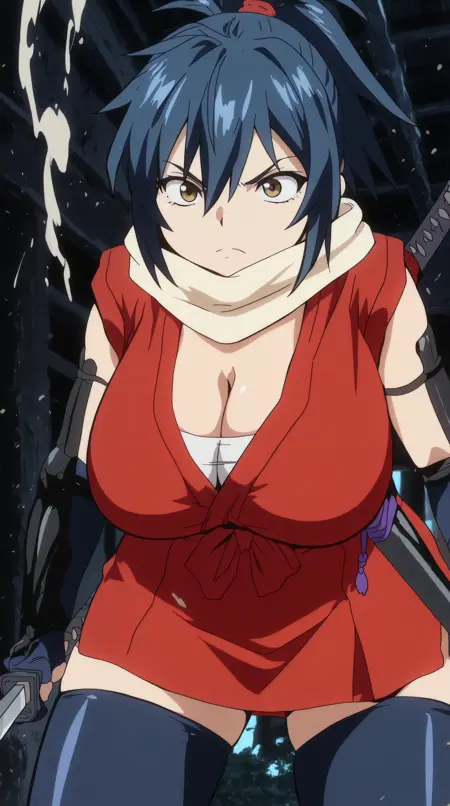 Trigger Words Optionnal: huge breasts, cleavage, fingerless glives, ninja, gloves, japanese clothes, ninja, sarashi, scarf, thighhighs, sandals