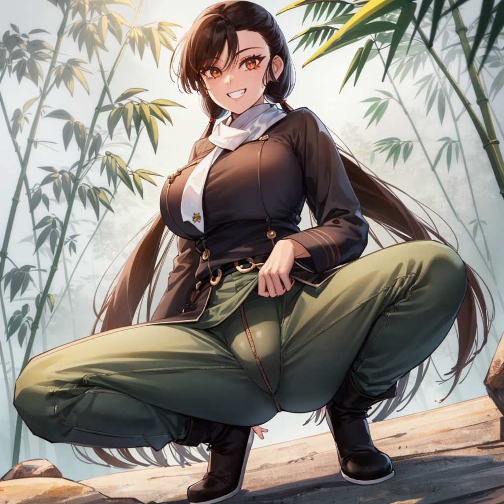 hudasheng, 1girl, solo, smile, brown hair, scarf, pants, chinese clothes, twintails, bamboo, boots, bird, black footwear, very long hair,