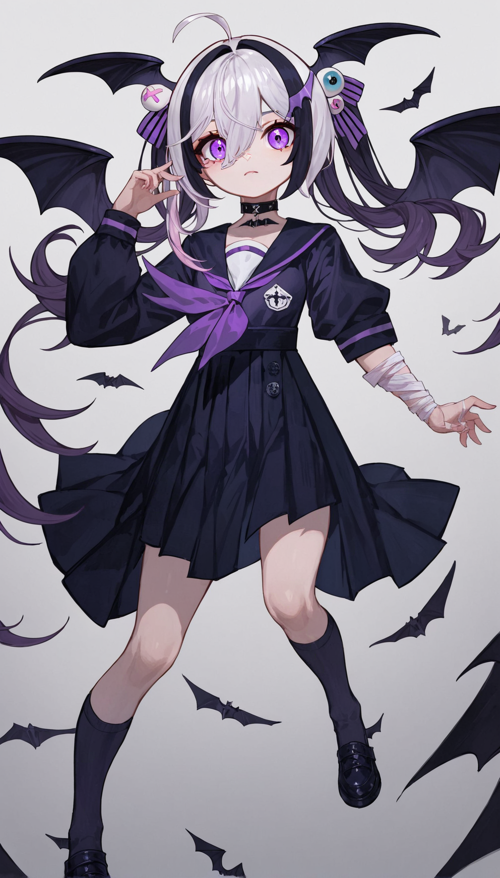 1girl, solo, hair ornament, head wings, ahoge, multicolored hair, streaked hair, skirt, school uniform, black wings, black choker, white kneehighs