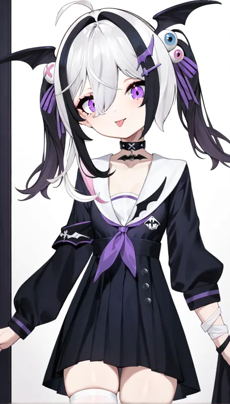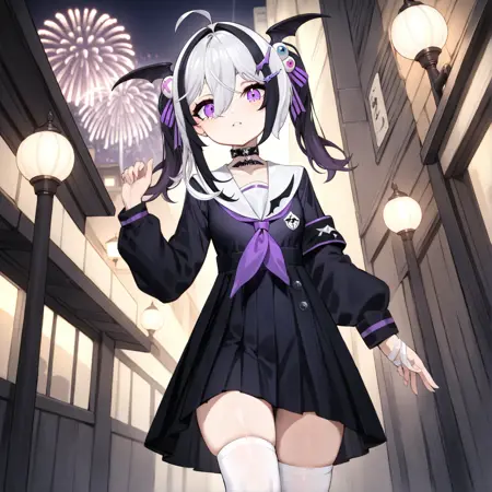 hair ornament, head wings, ahoge, multicolored hair, streaked hair, skirt, school uniform, black wings, black choker, white kneehighs
