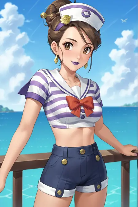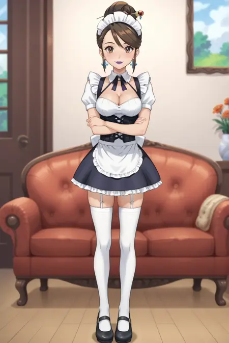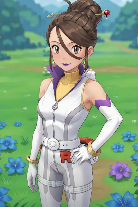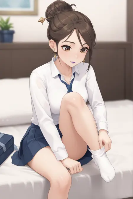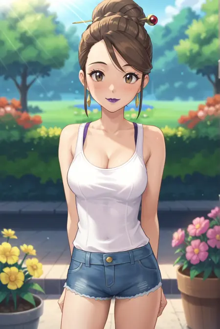 <lora:SierraXL-v1-07:0.7>, ChopioSierra, brown hair, single hair bun, hair stick, brown eyes, purple lipstick, earrings, looking at viewer,