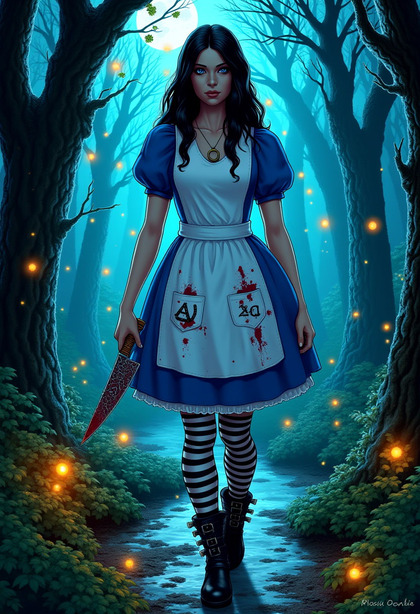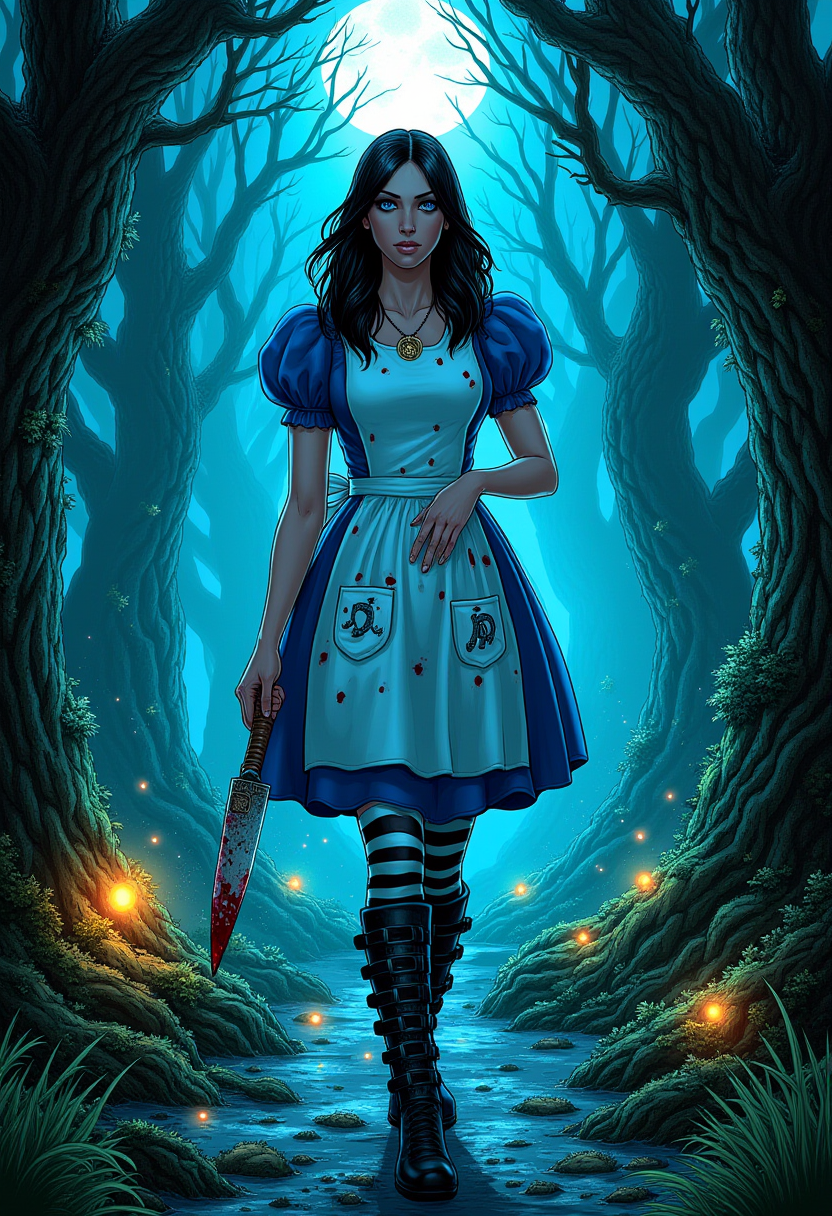 "prompt": "score_9, score_8_up, score_7_up, 1girl, solo, realistic, true to life, 4k, 8k, adult, long black hair, pretty, petite, green eyes, blue dress. apron, black and white stripped pantyhose, boots, necklace, holding a knife, blood stains, parted lips, face focus. In a mushroom forest. . close up, face focus, looking at viewer, wicked smile",