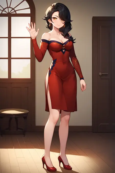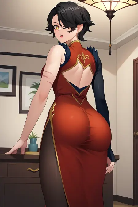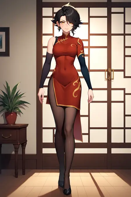 ➜ CinderFallRWBYXL,黄眼睛,黑发,短发,头发遮住一只眼睛,脸上有疤痕,耳环,中等胸部,单肩裸露,中式服饰,红裙,长袖,黑色肘套,单侧肘套,黑色连裤袜,黑色高跟鞋