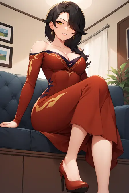 ➜ CinderFallRWBYXL,黄眼睛,黑发,长发,头发遮住一只眼睛,耳环,中等胸部,黑色项圈,露肩,胸线,红裙,长袖,红色高跟鞋