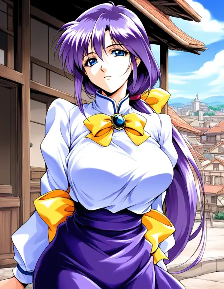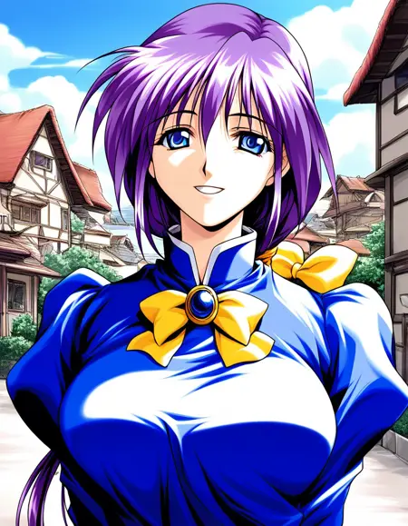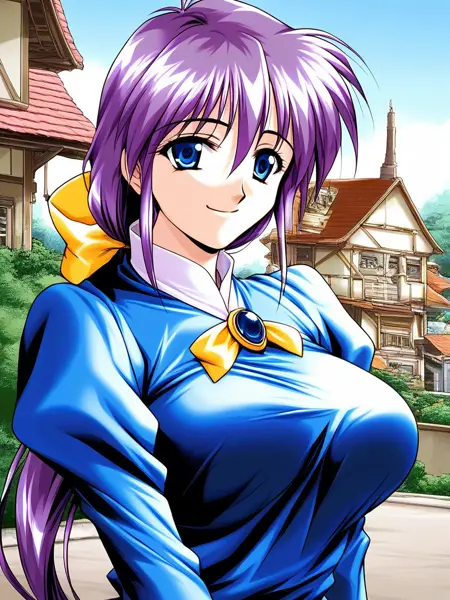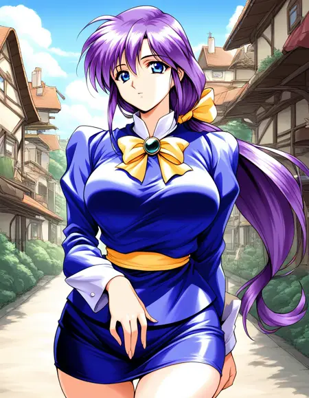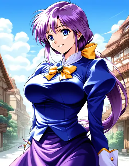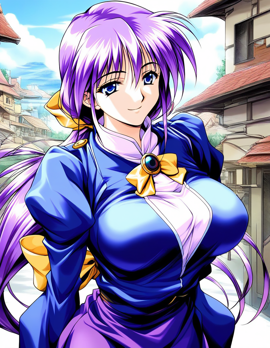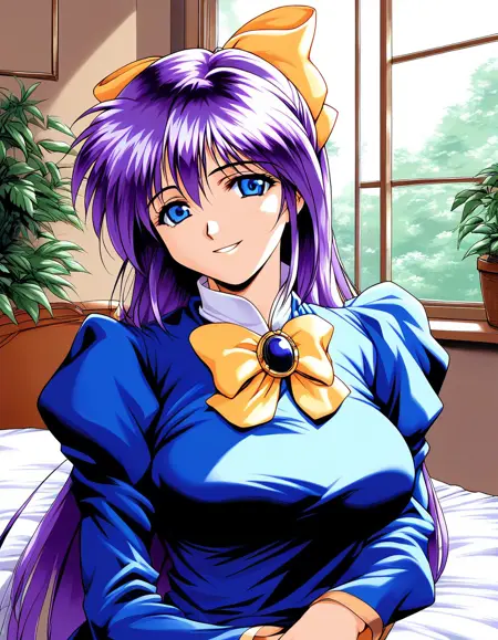 Kitazawa_Yukie, 1girl, solo, purple hair, long hair, large breasts, blue eyes, hair bow, yellow bow, low ponytail,