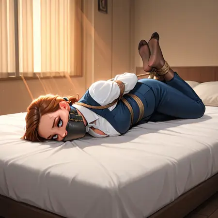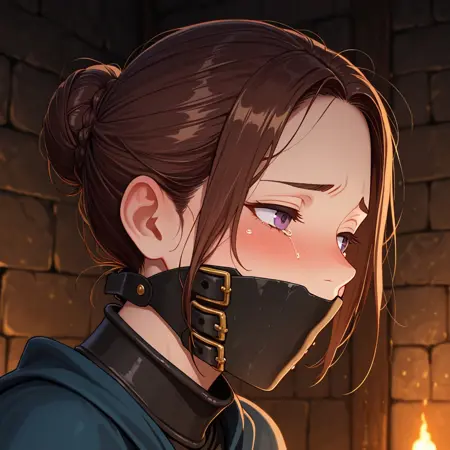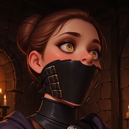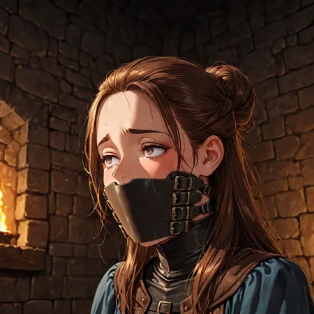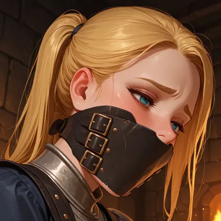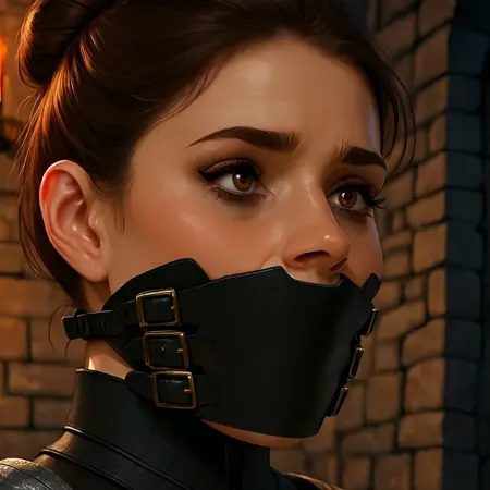 Panel Gag with (front) Buckles, also called a Bishop Panel Gag. Combination of the original 1.5 SD model and new training data - improved upscaling with R-ESRGAN.