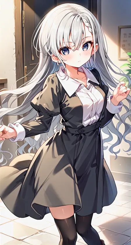 连衣裙,衬衫,耳环,眉毛透过头发可见,灰色头发,