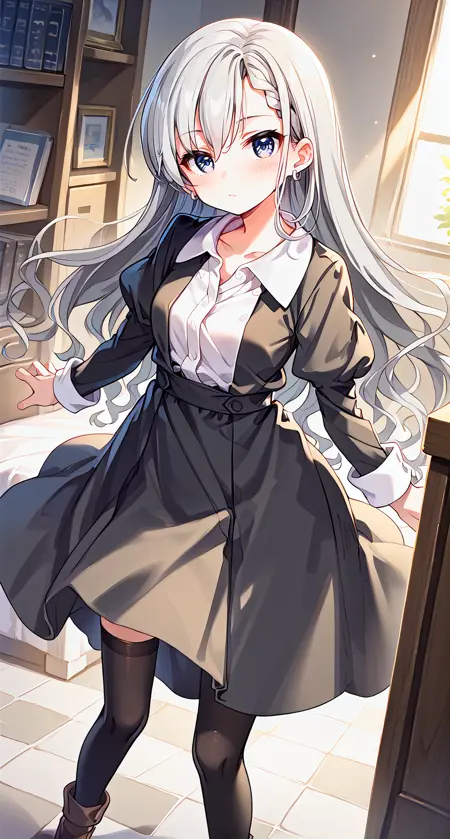 刘海,黑色连衣裙,黑色短裙,黑色过膝袜,蓝色眼睛,