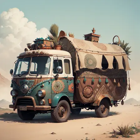 这个 TI 可以生成一些还不错的波西米亚风格图像,但有时会混淆……例如要求画一艘宇宙飞船,却生成了一辆卡车。也许对于这类 TI,需要在训练数据集中使用更多图片,并包含更多的主题变化?