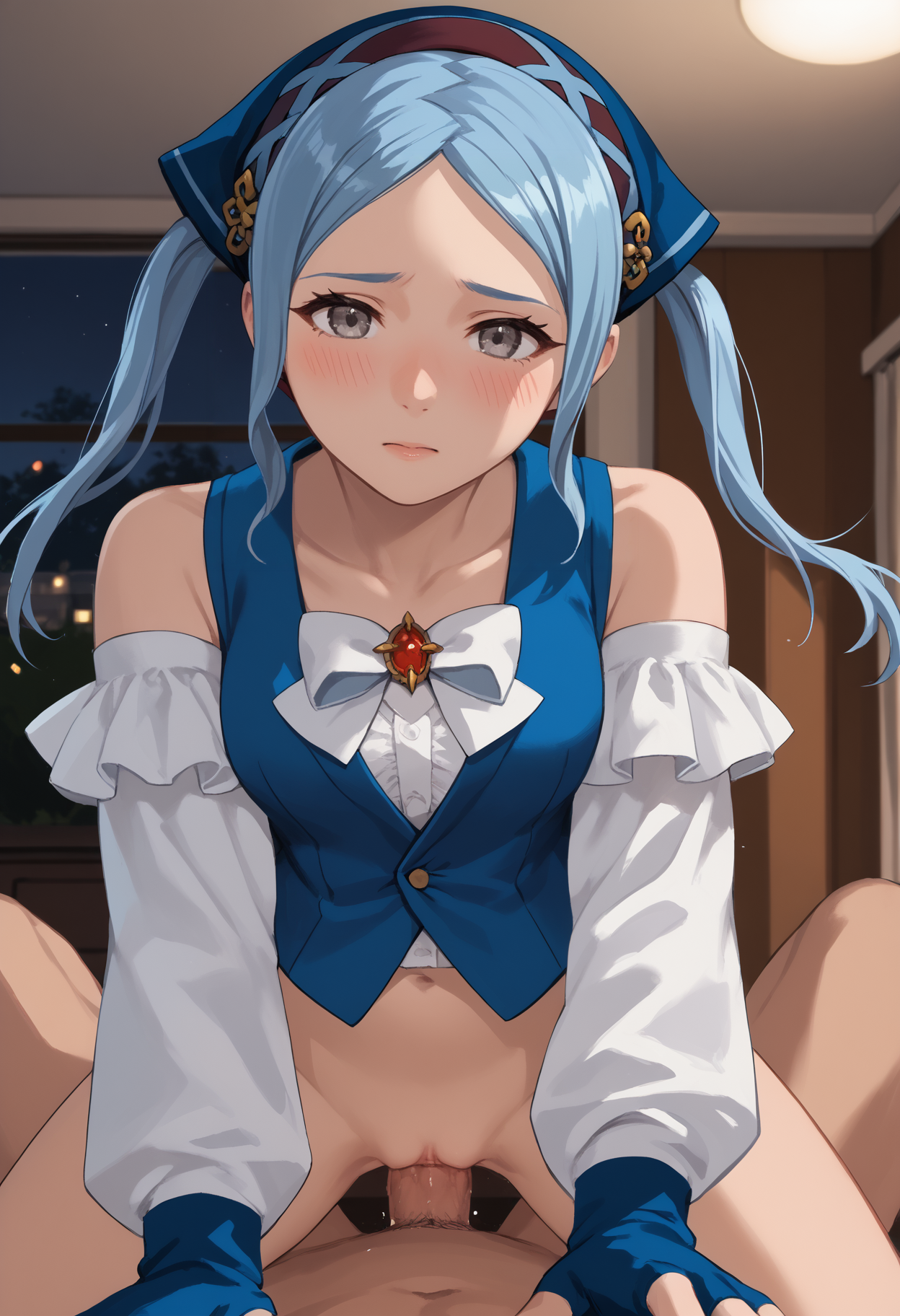 flrpcnc, 회색 눈, 파란 머리, 긴 머리, 트윈테일, 반다나, 가슴, 흰 리본, 흰색 조끼, 분리형 소매, 긴 소매, 흰색 소매, 어깨 노출, 손가락 없는 장갑, 파란 장갑, 벨트, 파란 반바지