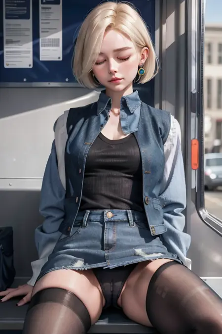 다음 항목을 추가하세요: accidental exposure panties, short skirt, train, sleeping, closed eyes,