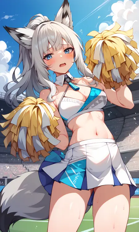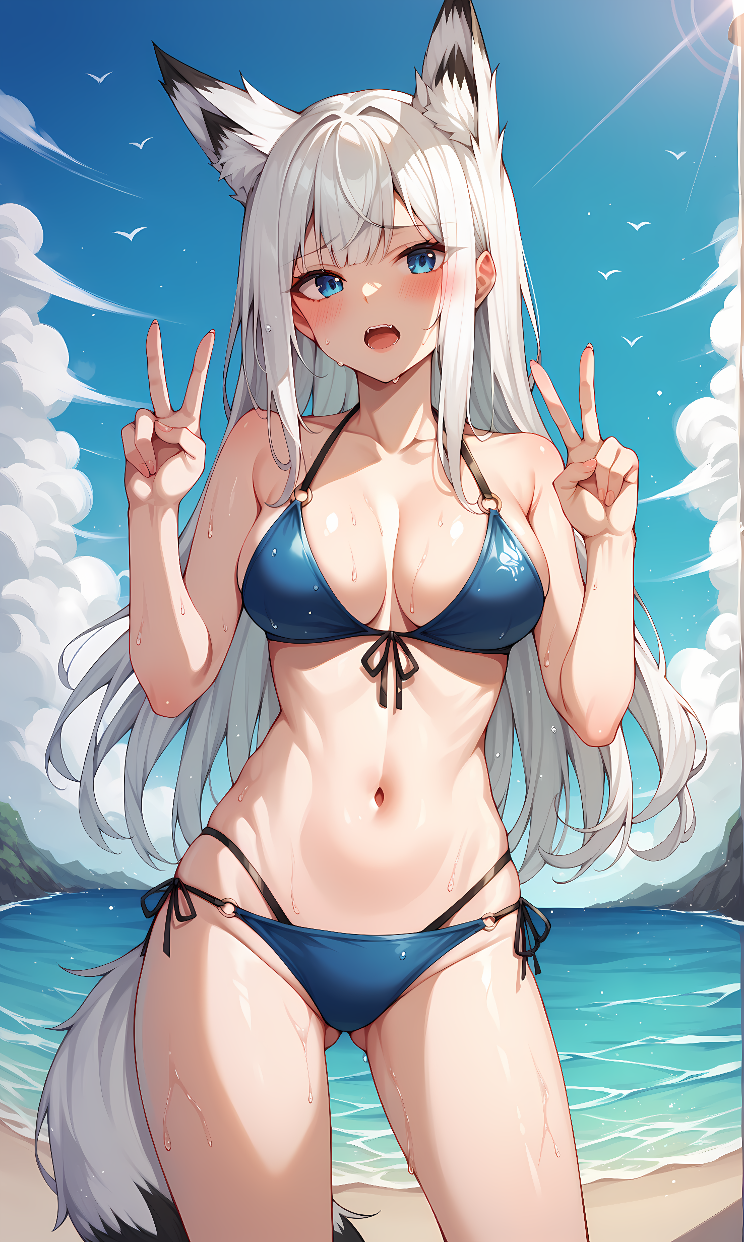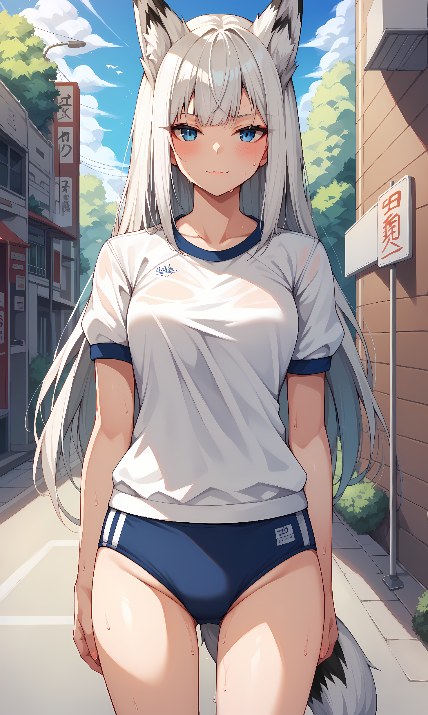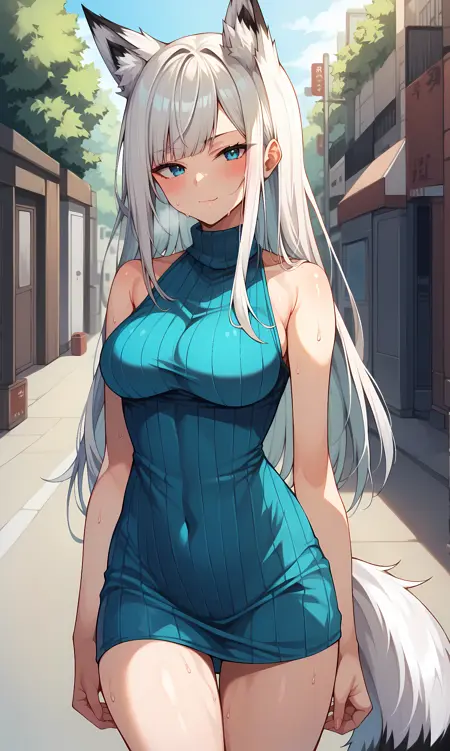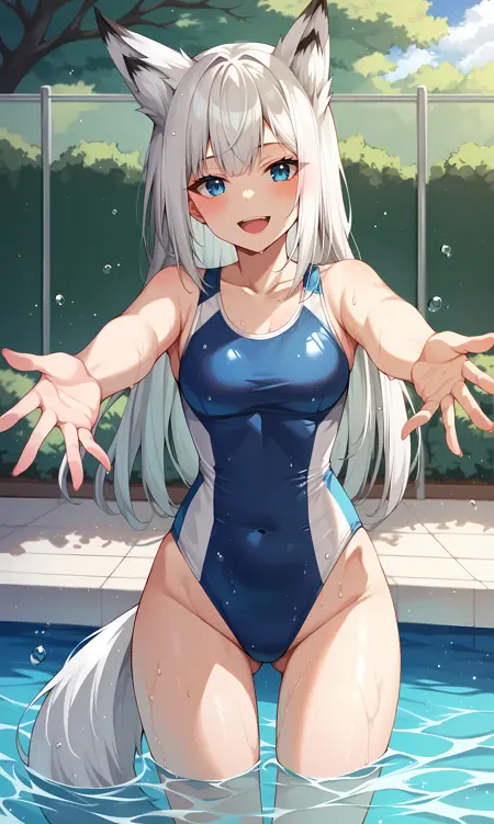 外観: 川風、青い目、白い髪、長い髪、狐の耳、狐の尾