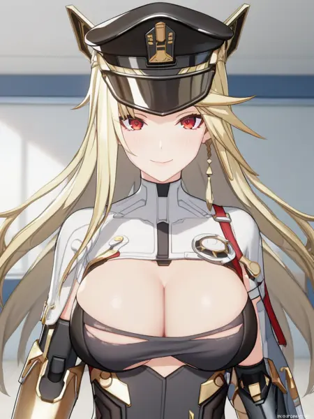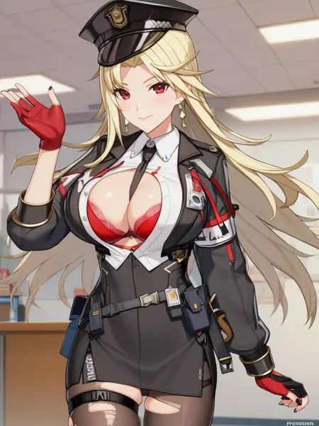 Sekhmet_AG, Dangerous_Training_Outfit, 1girl, red gloves, red eyes, pantyhose, black adpolice hat, torn pantyhose, long hair, necktie, breasts, uniform, blonde hair, black pencil skirt, black police jacket, red bra, white dress shirt, partially unbuttoned, black nails, skindentation, red gloves, thigh strap, cleavage, earrings, black pantyhose, pouch, fingerless gloves, open clothes, belt, large breasts,