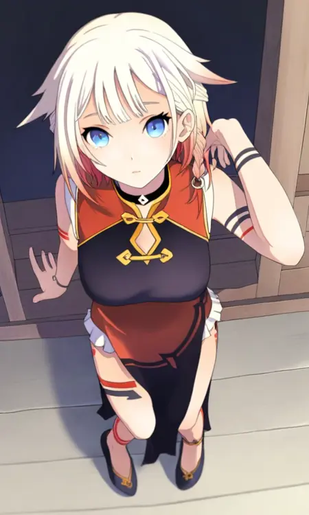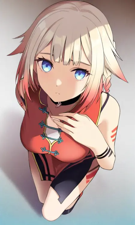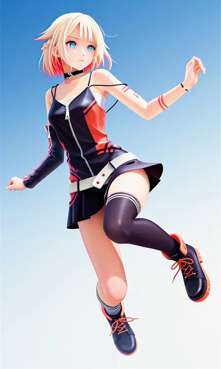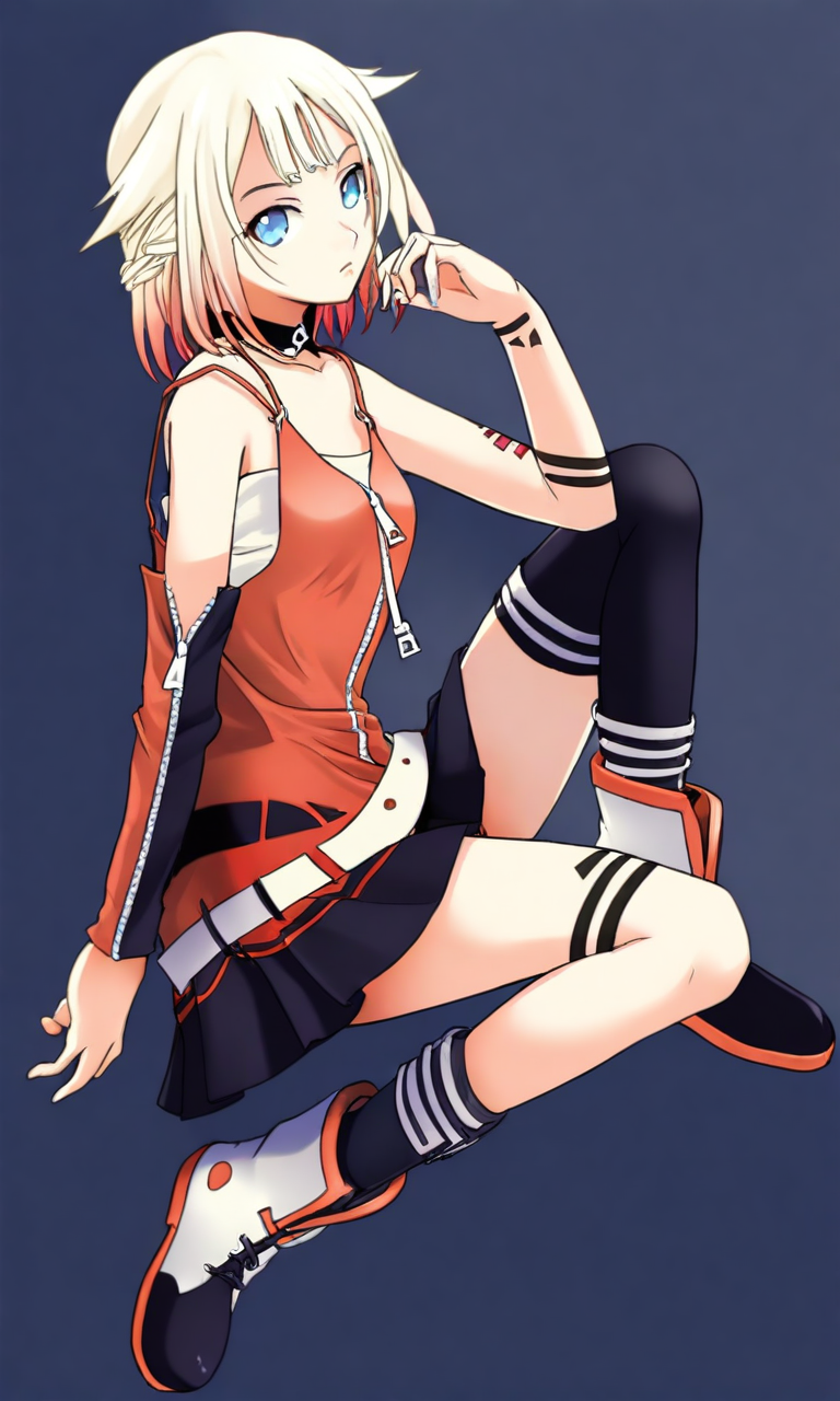 | 학습된 단어 | ONE_CeVIOIL,1girl,blue eyes,blonde,multi-colored hair,short hair,braid,hair flaps,choker,복사됨! bare shoulders,single detached sleeves,minidress,spaghetti strap,arm markings,leg markings,zipper,white belt,black skirt,assymetrical legwear,cross-laced footwear복사됨! |