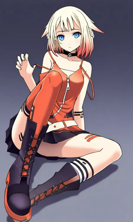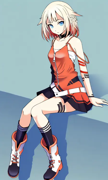| 训练词汇 | ONE_CeVIOIL,1girl,blue eyes,blonde,multi-colored hair,short hair,braid,hair flaps,choker,已复制! bare shoulders,single detached sleeves,minidress,spaghetti strap,arm markings,leg markings,zipper,white belt,black skirt,assymetrical legwear,cross-laced footwear已复制! |