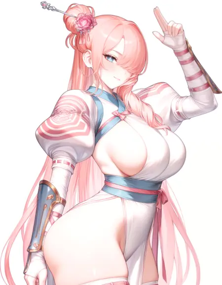 Sylviaswqueen, 큰 가슴, 긴 머리, 머리 땋기, 분홍색 머리, 한 눈을 가린 머리, 파란 눈, 흰색 저고리, 풍선 소매, 흰색 골반 커튼 드레스, 옆가슴 노출, 흰색 팔보, 팔보호대, 한국식 허리띠, 분홍색 끈, 흰색 허벅지 양말, 한국 전통 샌들,