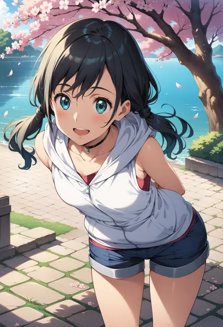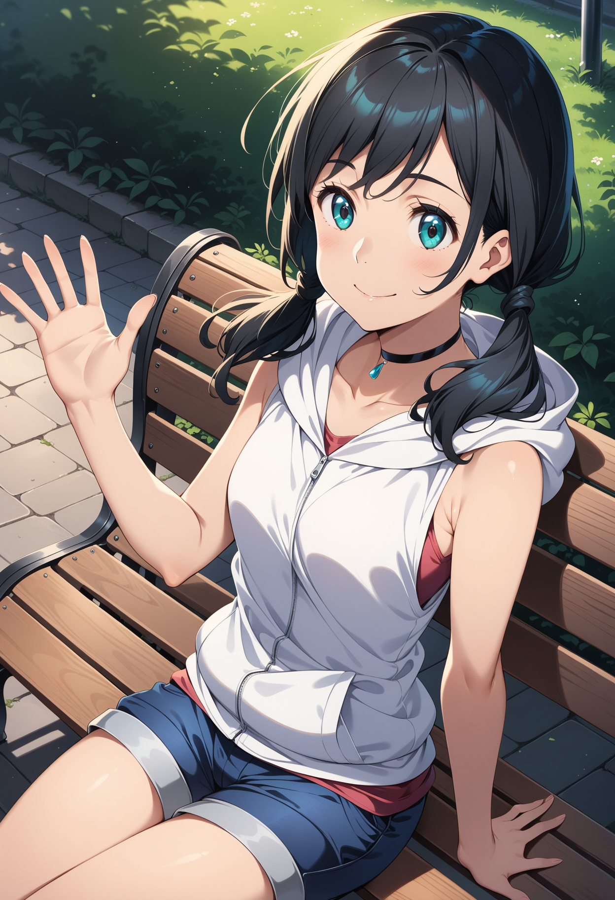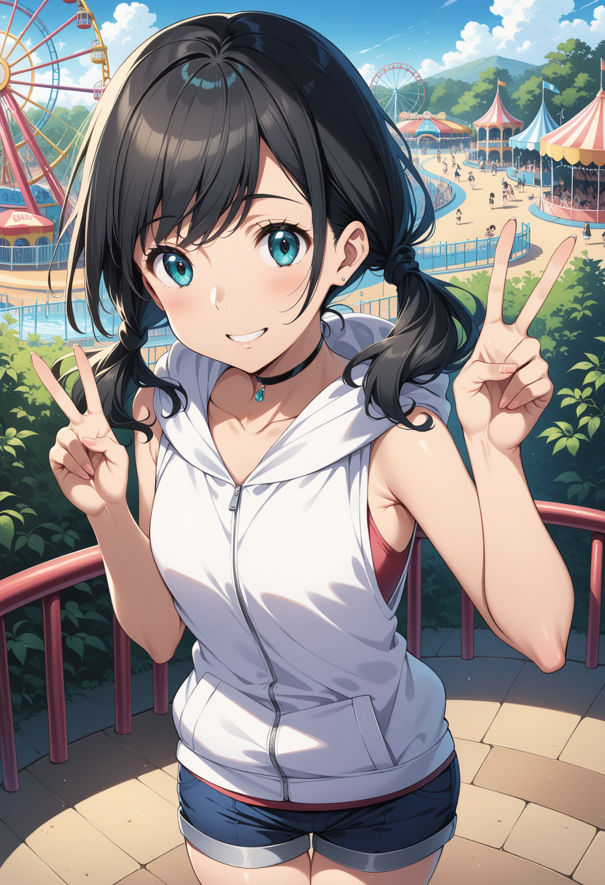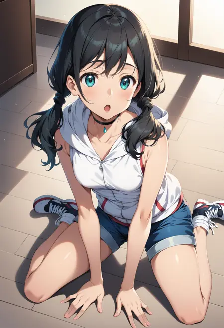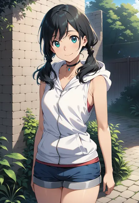 outfit1aahina, medium hair, black hair, low twintails, aqua eyes, small breasts, black choker, collarbone, bare shoulders, hood down, hooded jacket, white hoodie, sleeveless, short shorts, blue shorts