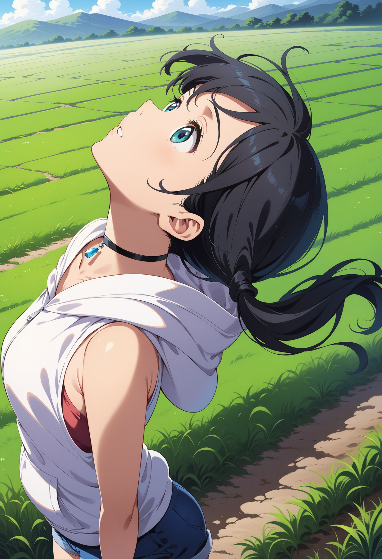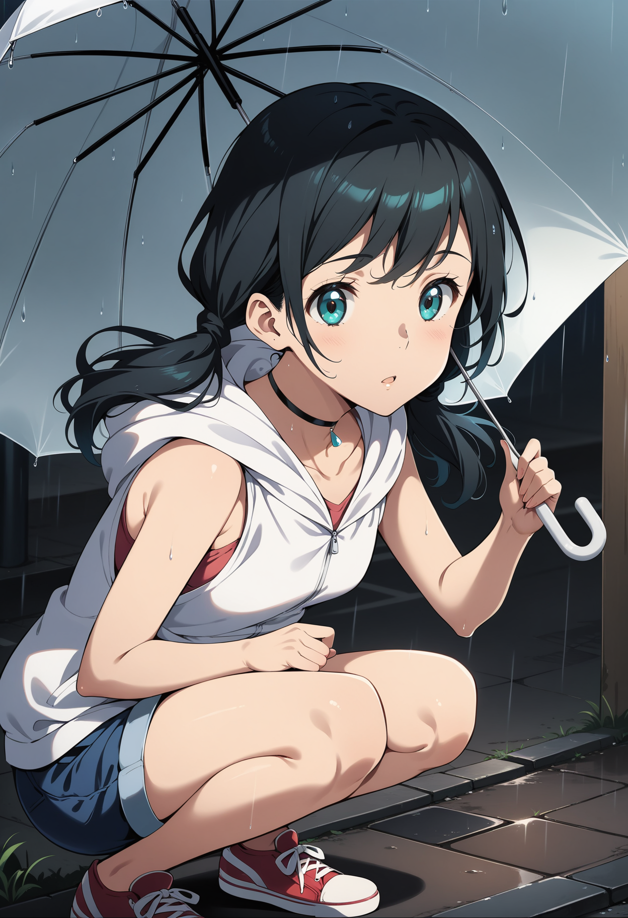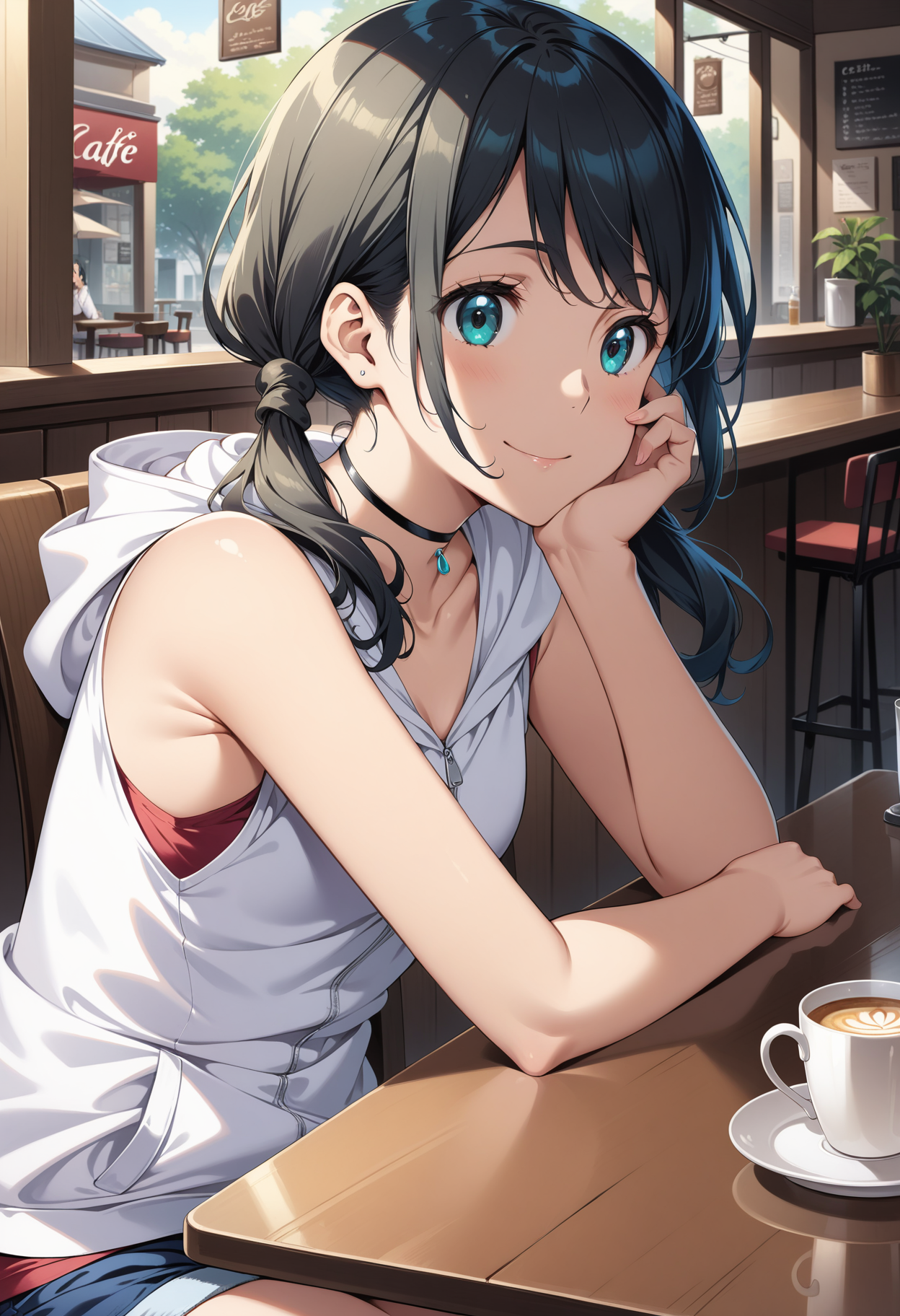 outfit1aahina, medium hair, black hair, low twintails, aqua eyes, small breasts, black choker, collarbone, bare shoulders, hood down, hooded jacket, white hoodie, sleeveless, short shorts, blue shorts