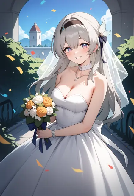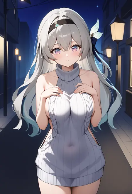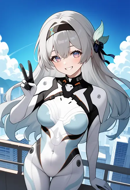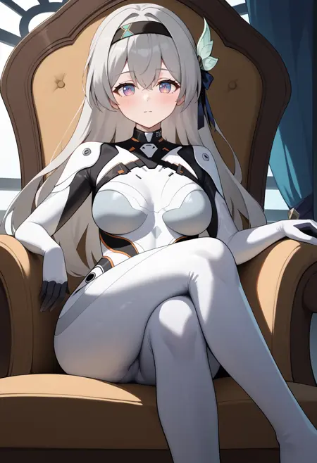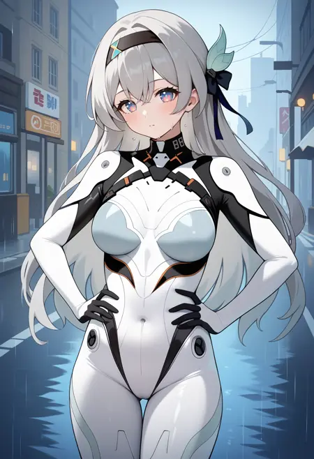 outfit2aahotaru, long hair, grey hair, black hairband, hair ornament, hair ribbon, multicolored eyes, breasts, white bodysuit, plugsuit