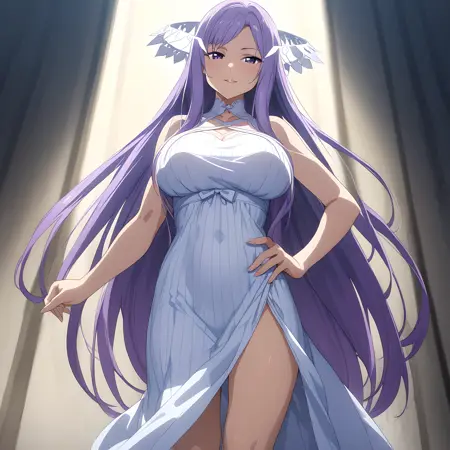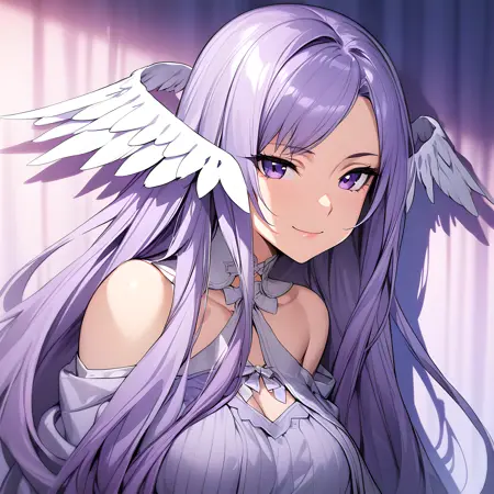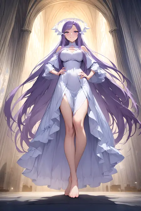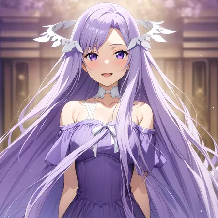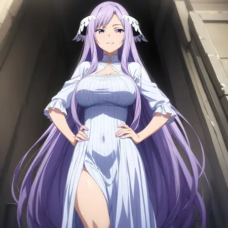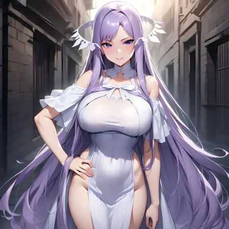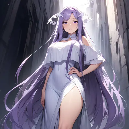激活标签为 "quinella"。外观描述为 "长发,非常长的头发,紫色头发,紫色眼睛"。你也可以使用 "anime coloring" 标签让画面更具动漫风格。服装标签见示例图片。