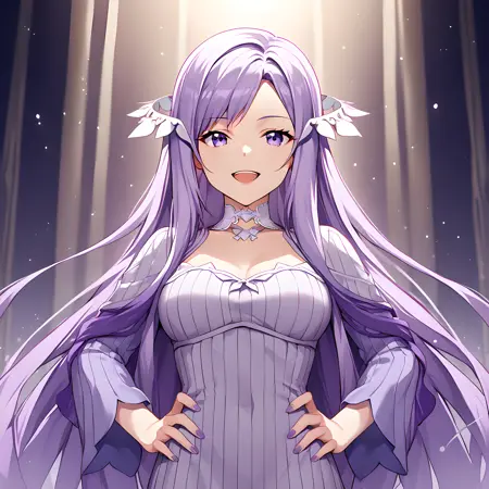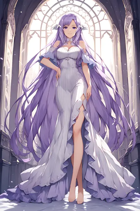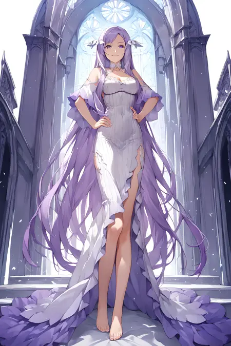 激活标签为 "quinella"。外观描述为 "长发,非常长的头发,紫色头发,紫色眼睛"。你也可以使用 "anime coloring" 标签让画面更具动漫风格。服装标签见示例图片。