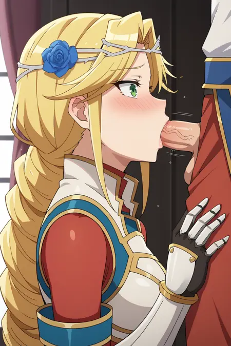 lakyusout1, braid, blue flower, hair flower, hair ornament, armor, gloves, gauntlets, white footwear, boots,
