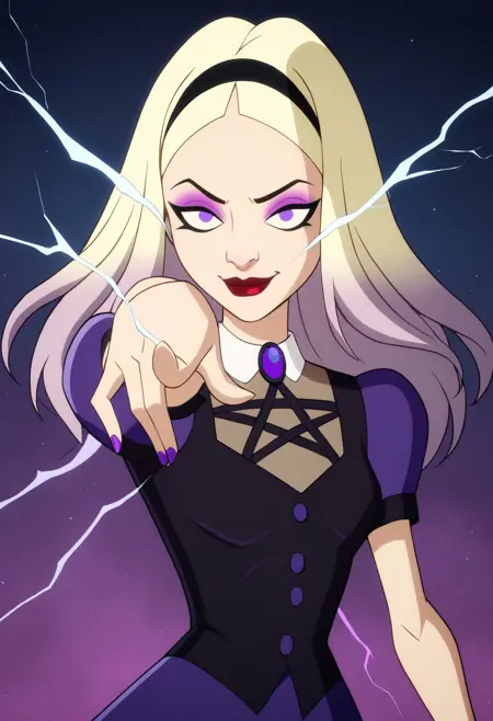 基本的な外見:金色の髪、黒いヘアバンド、鼻、化粧、赤い唇、紫色の目、長い髪、ドレス、グラデーション髪、ふわふわの短い袖、ストライプのパンティーハイズ、ゴスブーツ