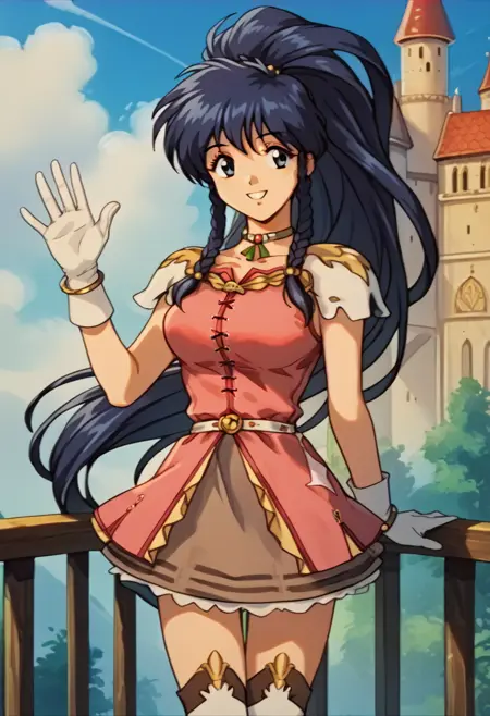 Default appearance: defTana, long hair, high ponytail, hair ribbon, twin braids, neck ring, pink dress, white belt, short dress, pauldrons, white gloves, bracelet, brown skirt, thigh boots