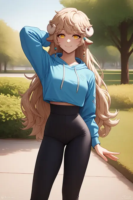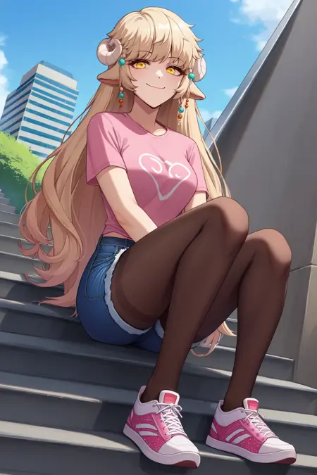 メインプロンプト:NSLaraMisc、金色の髪、長い髪、黄色い目、巻き角、動物の耳、髪飾り