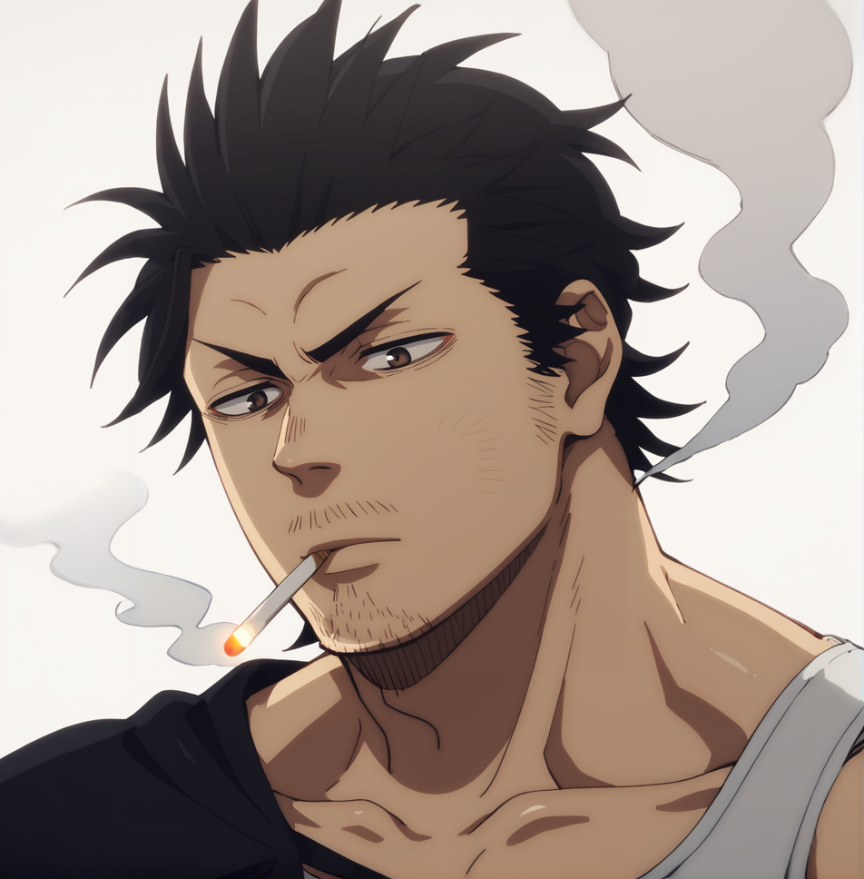 yami sukehiro, mature, man, male focus, 1boy, stubble, facial hair, black hair, brown eyes, muscular, bara, white tank top, pectorals, black capelet