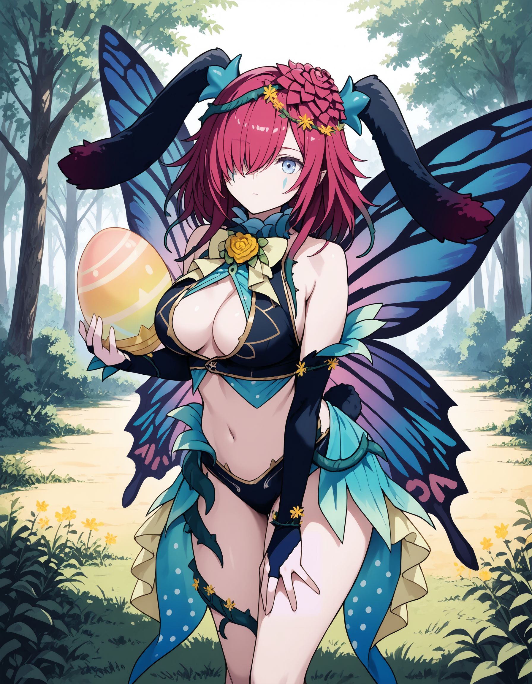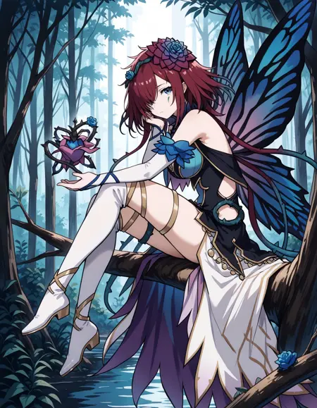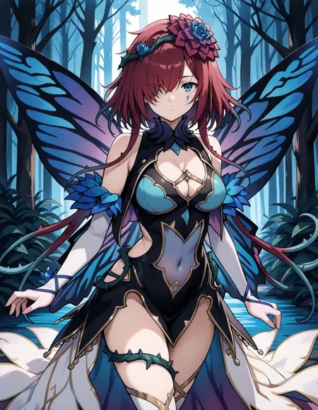 彼女の調整済み外見には、「青い髪の花、蝶の翼、白いブライダルグローブ、青いドレス、太ももストラップ、太ももブーツ」を追加してください。
