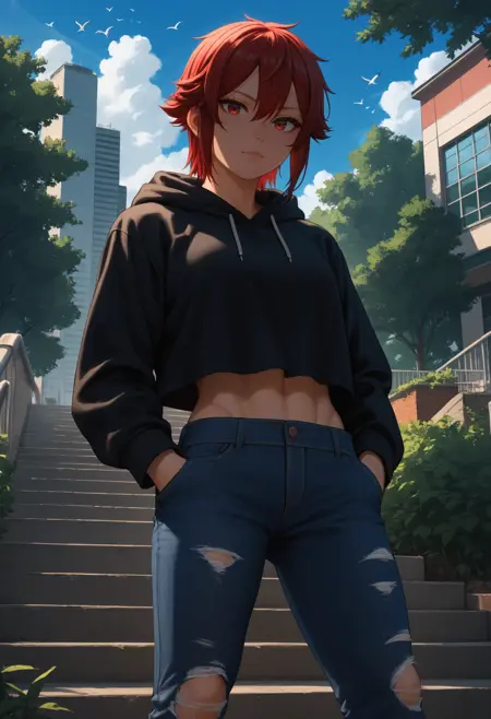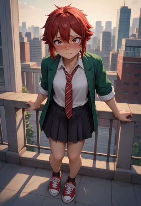 교복 복장을 사용할 때 항상 빨간 머리, 단발, 빨간 눈, 소녀스러운 스타일의 기본 정보를 추가하세요.