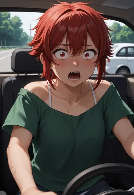 "전체 외모/기본 정보": aizawatomo, 빨간 머리, 단발, 빨간 눈, 소녀스러운 스타일, 옵션: 피부 송곳니,