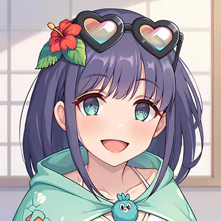 misorapcr2, eyewear on head, standing, medium hair,misorawe bikini, misorawe side-tie bikini bottom, heart-shaped eyewear, green capelet, hair flower, thigh strap, sandals,