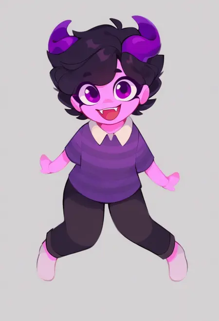 jellybean_yt, solo, looking at viewer, smile, short hair, open mouth, shirt, black hair, 1girl, white background, purple eyes, horns, teeth, striped, collared shirt, colored skin, fangs, striped shirt,