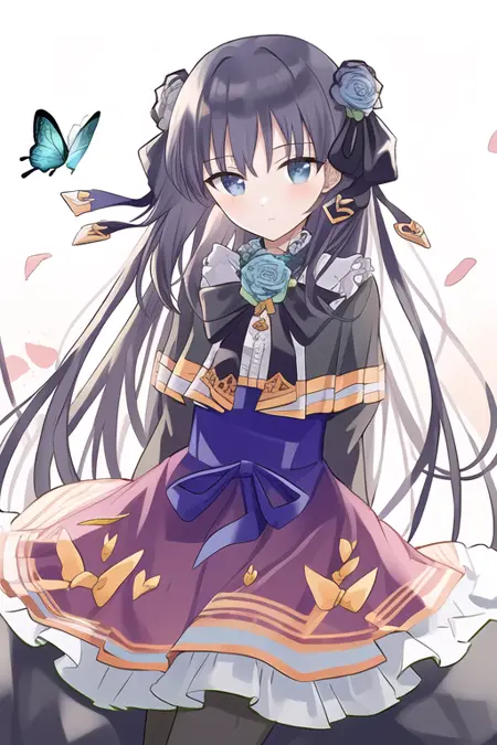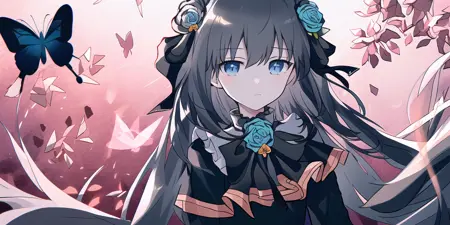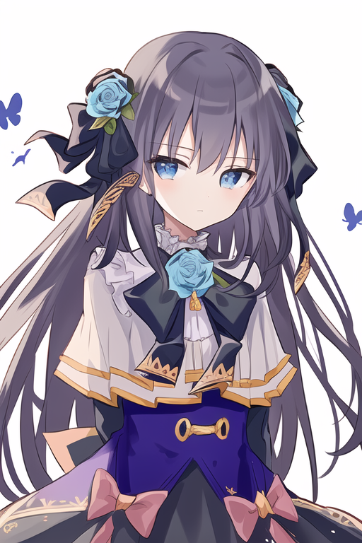 example: tairitsu,rose, flower, pink rose, 1girl, butterfly, bouquet, solo, white rose, yellow rose, ribbon, long sleeves, red rose, white flower, purple rose, puffy sleeves, shirt, blue flower, blue rose, flower, blue bow,floating hair, long hair,dress, black hair,hair ornament, purple rose, looking at viewer,
