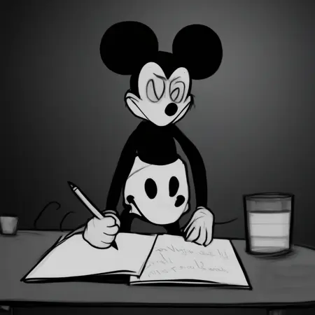 私は、Wednesday's Infidelity という FNF モッドで Sadmouse.avi を見ました。このモッドでは、ステムボート・ウィリーがモノクロの街を無限ループで歩き、徐々に狂気へと陥っていく様子が描かれています。ディズニーの明るいネズミが creepypasta に変わるというその不気味さから、私は彼をキャラクター LoRA にする決断をしました。