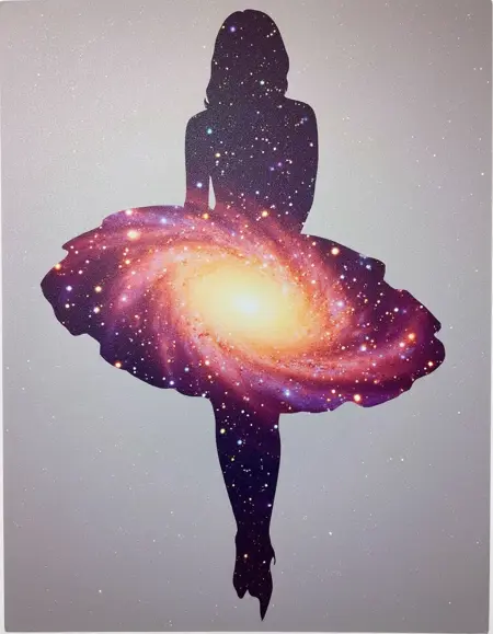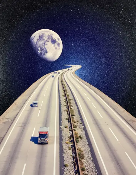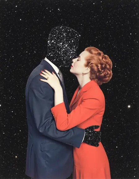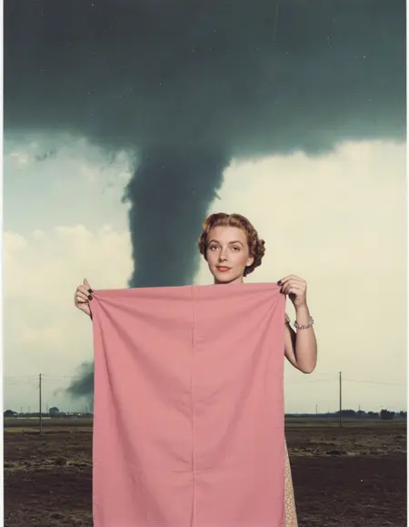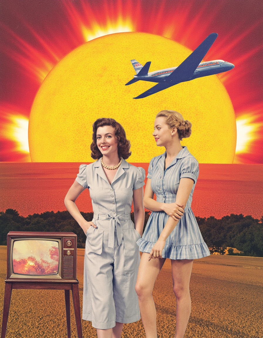 '당신의 프롬프트'의 사진 콜라주, joe-webb 스타일로휠로 히ula를 하며 춤추는 여자, joe-webb 스타일로