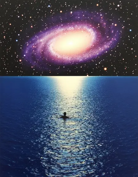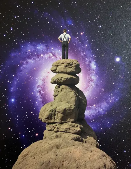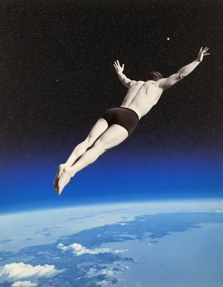 배경에 행성이 있는 풀을 치는 남자, joe-webb 스타일로