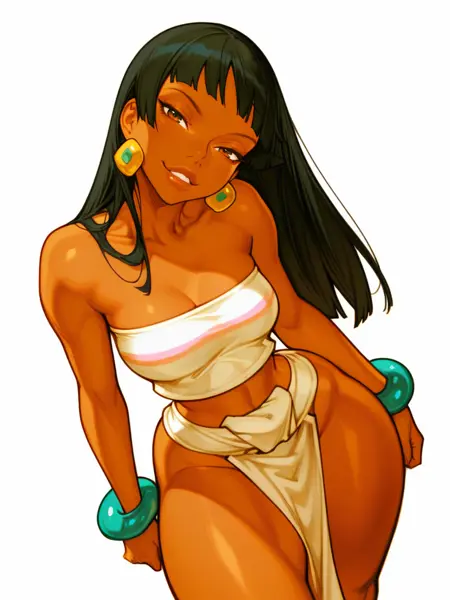 - 主服装: "长发,黑发,刘海,棕色眼睛,深肤色,嘴唇,耳环,背心式上衣,无袖,露出腹部,手镯,腰裙,骨盆帘"