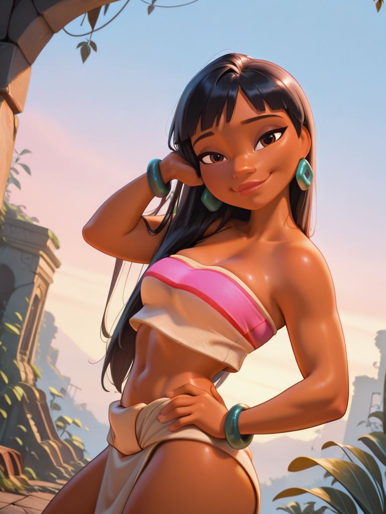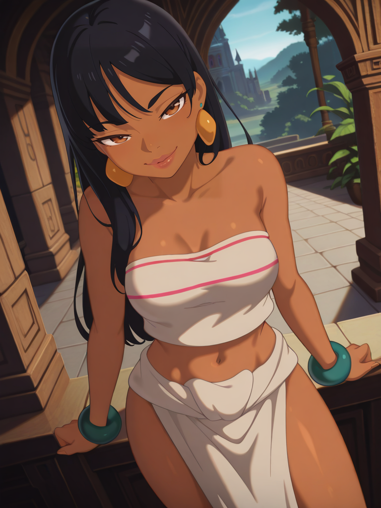 Use the activation word "ChelXLP" "dark skin, blunt bangs, long hair, black hair, jewelry, earrings, bracelets, makeup, tube top, loincloth_"_ Improve with: "Cartoon".