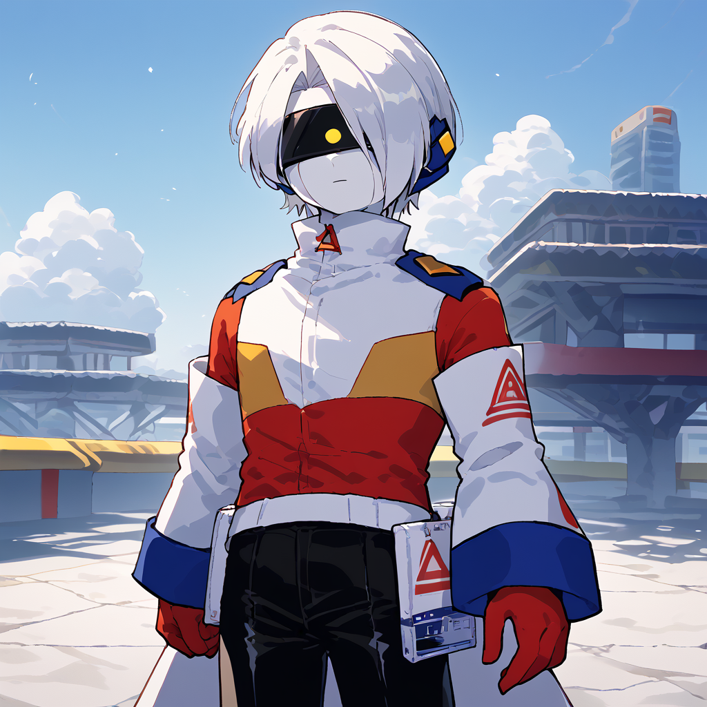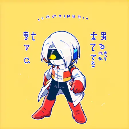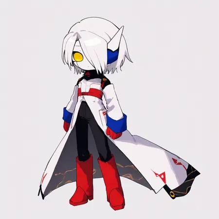 hrhgijinka, white hair, short hair, android, hair over one eye, black visor, yellow eyes, white skin, colored skin, gloves, red gloves, white jacket, long sleeves, red boots, black pants