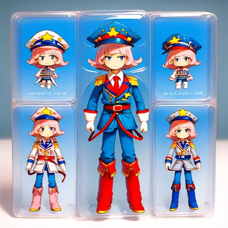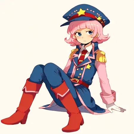 kirbman, pink hair, flipped hair, short hair, blunt bangs, blue eyes, blue peaked cap, star \(symbol\), red belt on hat, epaulettes, white undershirt, red tie, red knee-high boots, red pants, grey vest, blue overcoat with pink trim, long sleevs, white gloves
