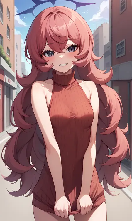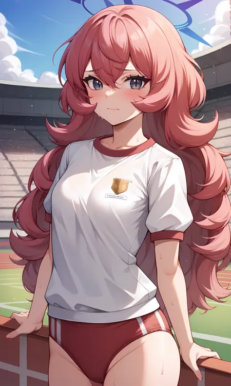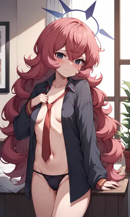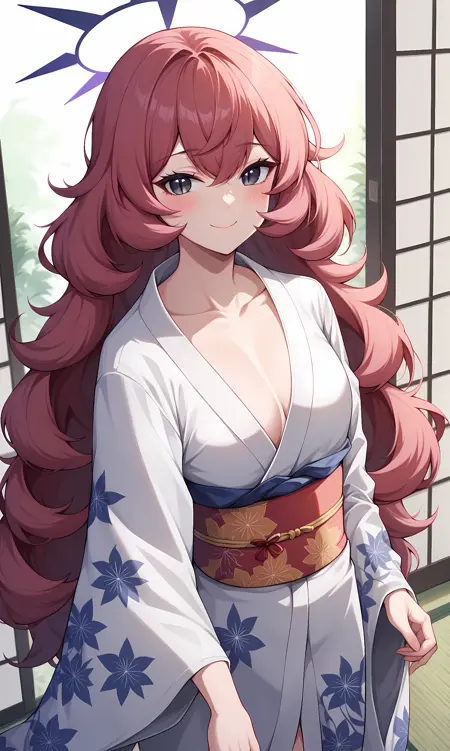 외모: 이로하, 검은 눈, 수직 동공, 빨간 머리, 매우 긴 머리, 물결 모양의 머리, 환상