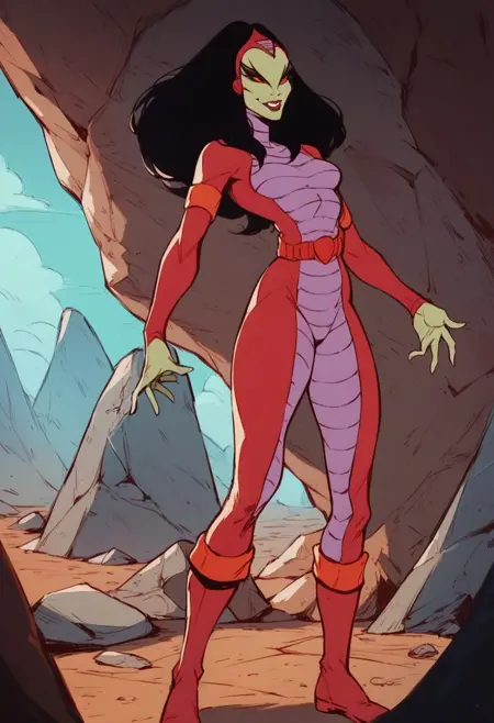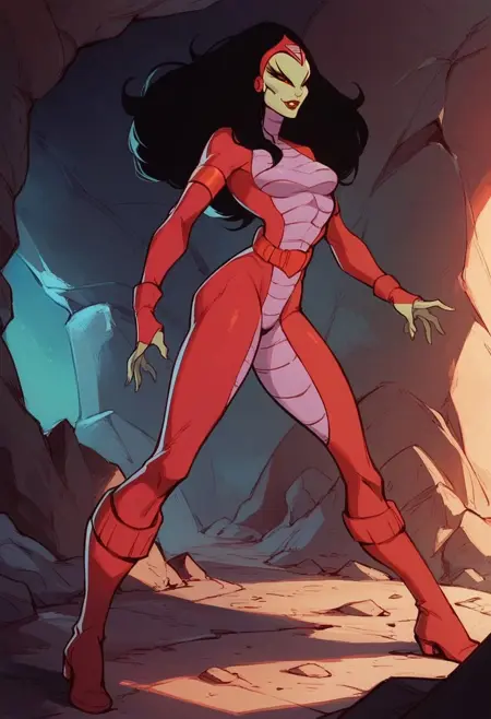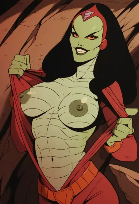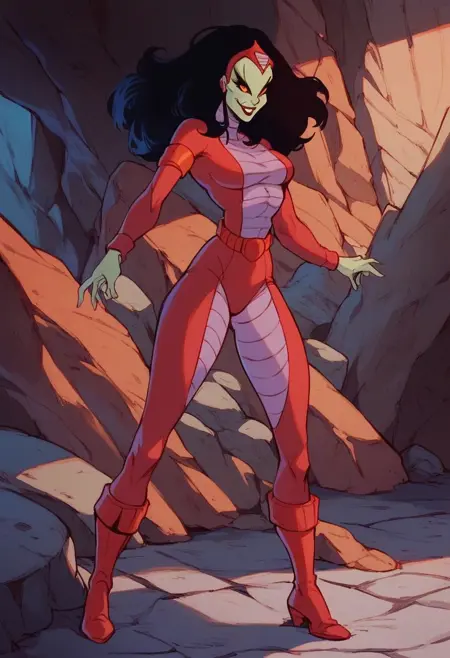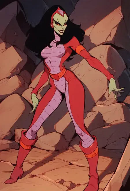 タグは「Vipra、宇宙人女性、黒髪、ボディスーツ、赤いブーツ、赤い頭飾り」。彼女が服の半分だけを着ているような姿であれば、「緑色の肌」を明確に指定した方が良いかもしれません。または、好みに応じて「緑色のうろこ肌」としてもよいでしょう。