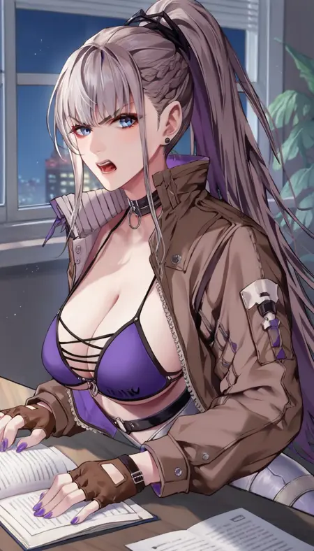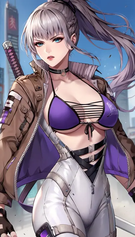 BaiYiPTN, 푸른 눈, 회색 머리, 보라색 오므브, 긴 머리, 높은 토끼 꼬리, 앞머리, 큰 가슴, 갈색 재킷, 보라색 비키니 상의, 검은 허리 스트랩, 은색 바디수트, 초커, 손가락 없는 장갑, 하이힐