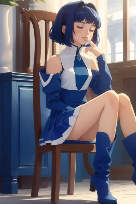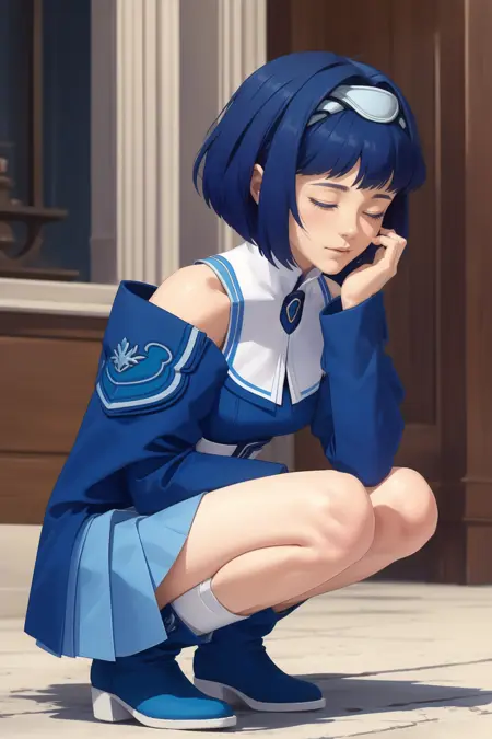 blue sleeves, bare shoulders, blue shirt, white pleated skirt, blue boots,