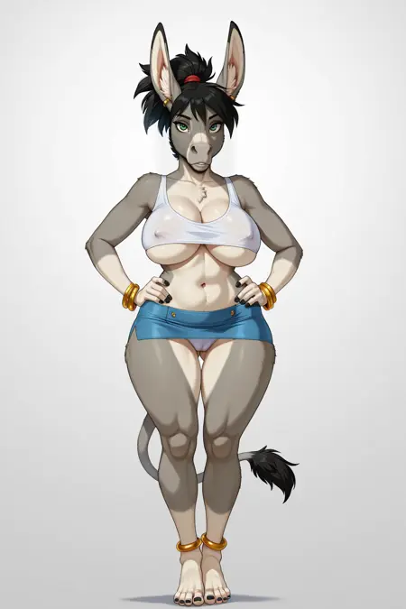 score_9, score_8_up, score_7_up, bedroom background, night, 1girl, furry, solo, furry female, breasts, nipples, tail, panties, animal ears, underwear, large breasts, jewelry, shirt lift, clothes lift, excessive sweat, clothing wet, navel, pubic hair, earrings, snout, o-ring, female pubic hair, bracelet, brown hair, white panties, o-ring bottom, dark nipples, dark skin, short hair, multicolored hair, by jaleo, equid, equine, horse