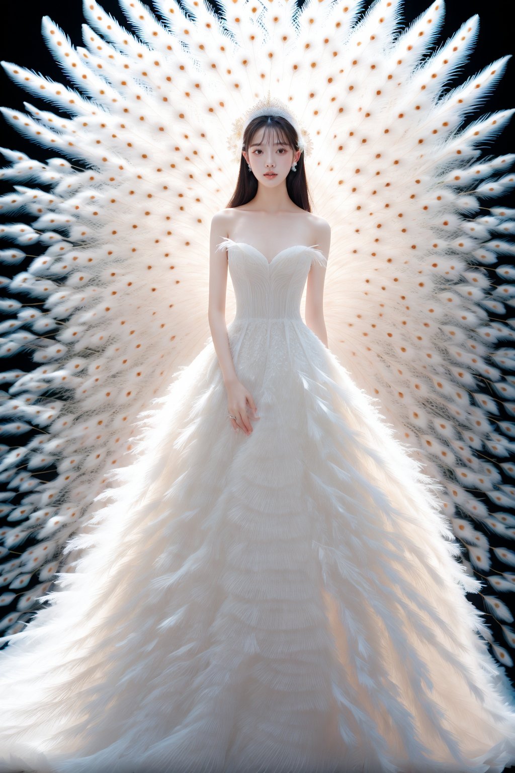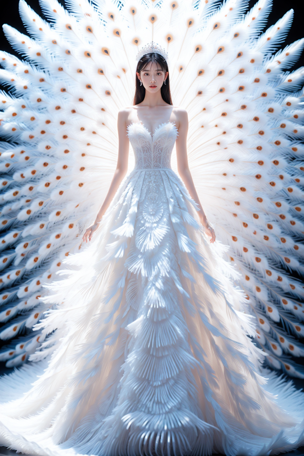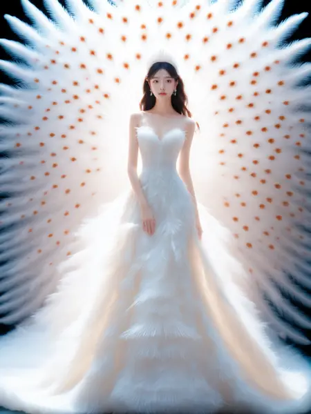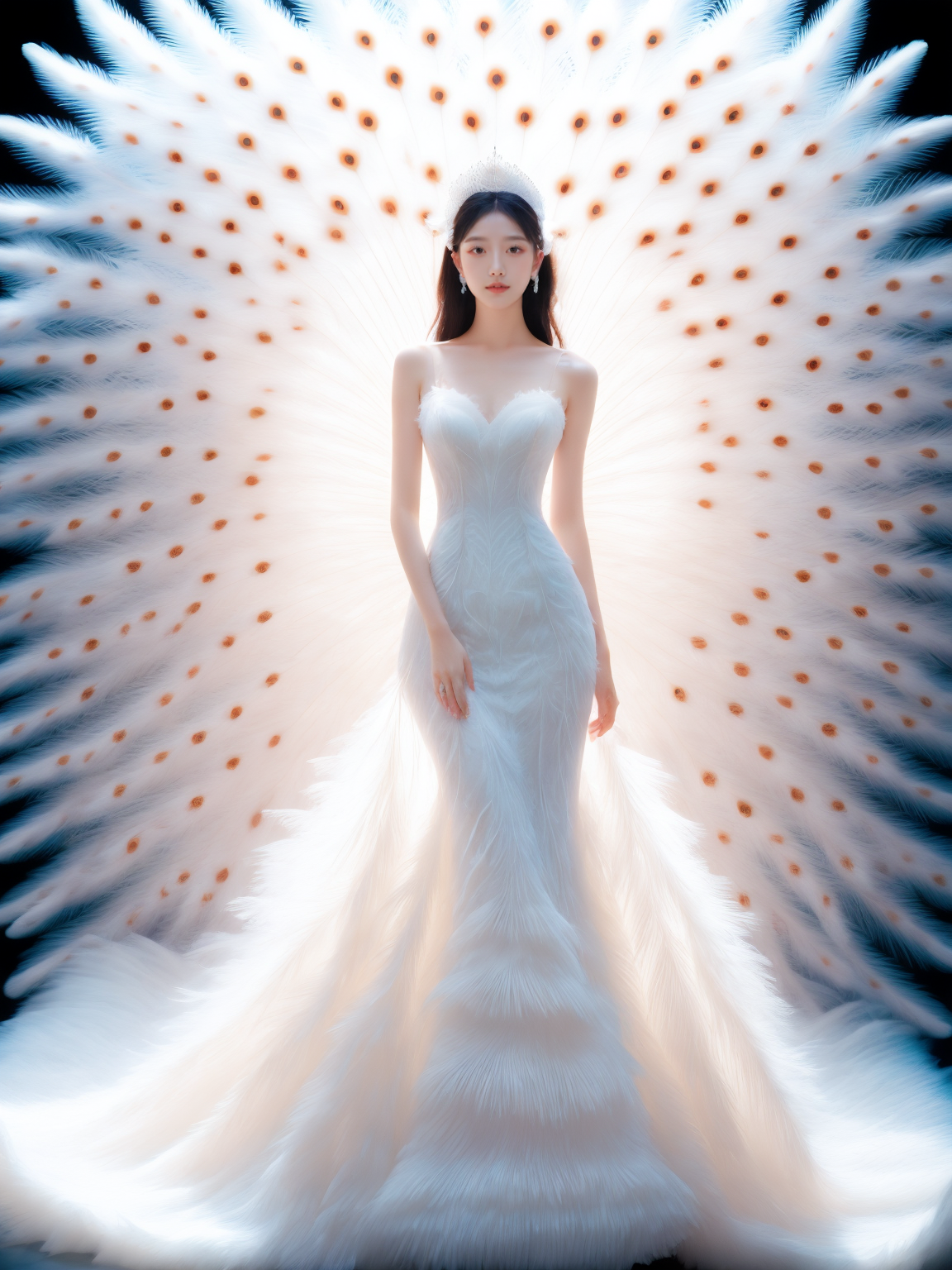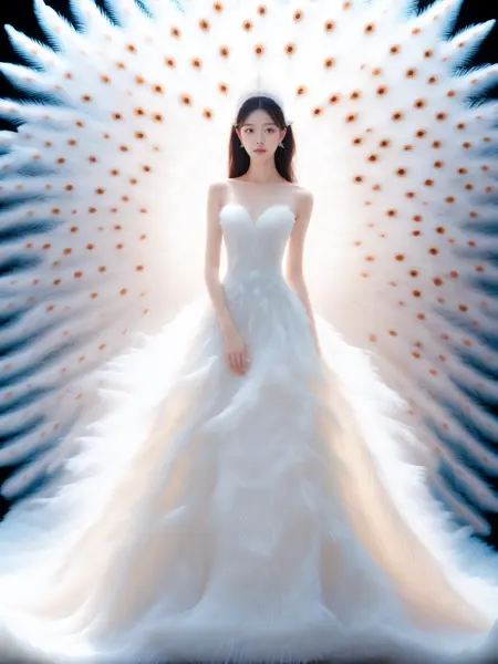 Inspired by feather fashion and the background are streamlined peacock feathers. Pure white creates a completely elegant photo for women!