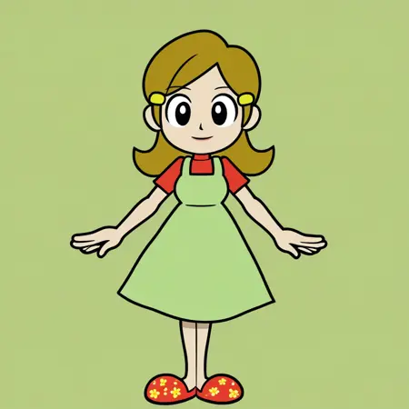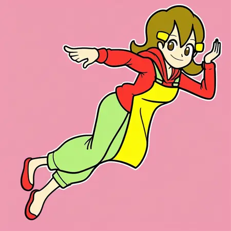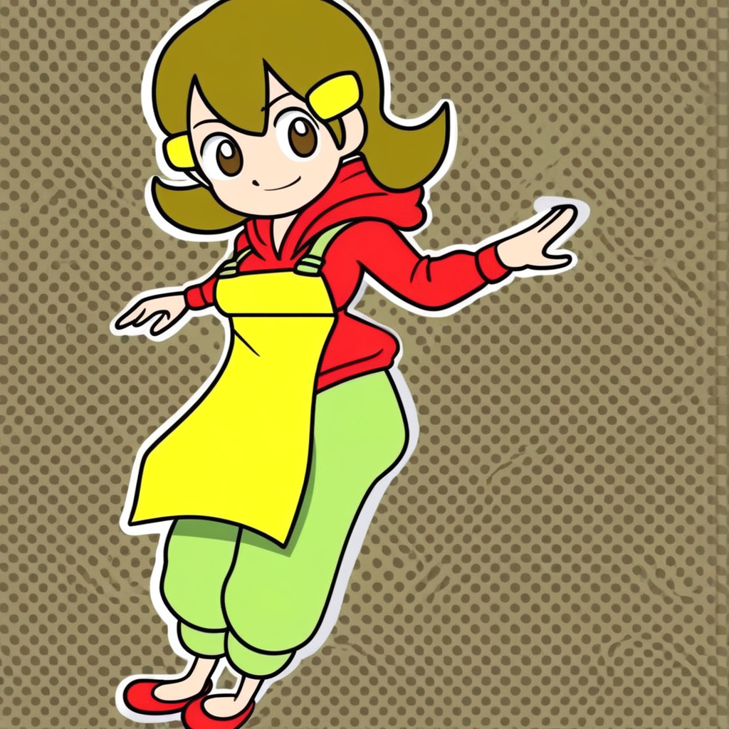 for her modern design, use red hoodie, yellow apron, green pants, red slippers